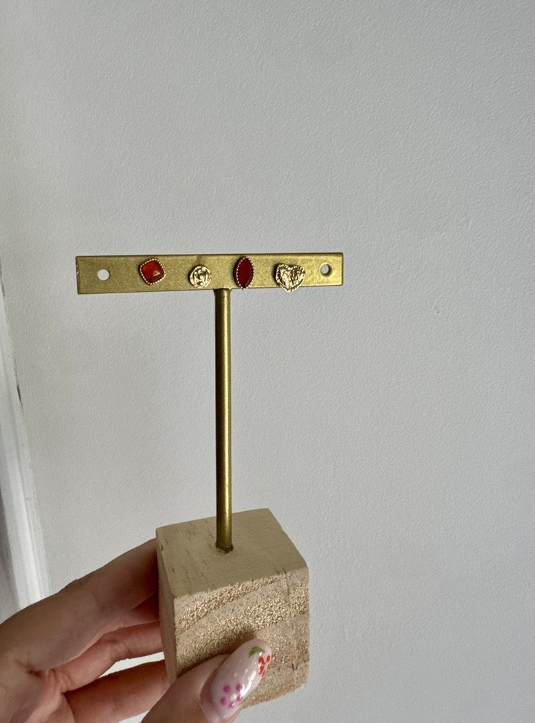 Boucles d'oreilles à puce en acier inoxydable composées de 4 boucles aux motifs différents (rond martelé, coeur martelé, carré et goutte), dont deux sont serties d'une pierre naturelle.