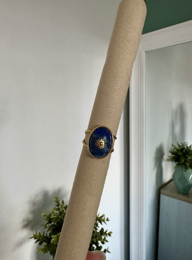Bague en acier inoxydable composée d'un soleil sur une pierre naturelle ovale de Lapis-Lazuli. Ajustable, la bague se resserre ou s'agrandit : de la taille 52 à 56 \nHauteur de la bague: 18mm \n \nGarantie sans nickel, sans cadmium, sans sel de plomb. Résiste à l’eau et ne noircit pas. \nÉtant des pierres naturelles, leurs couleurs et leur taille peuvent varier d’une pierre à l’autre.
