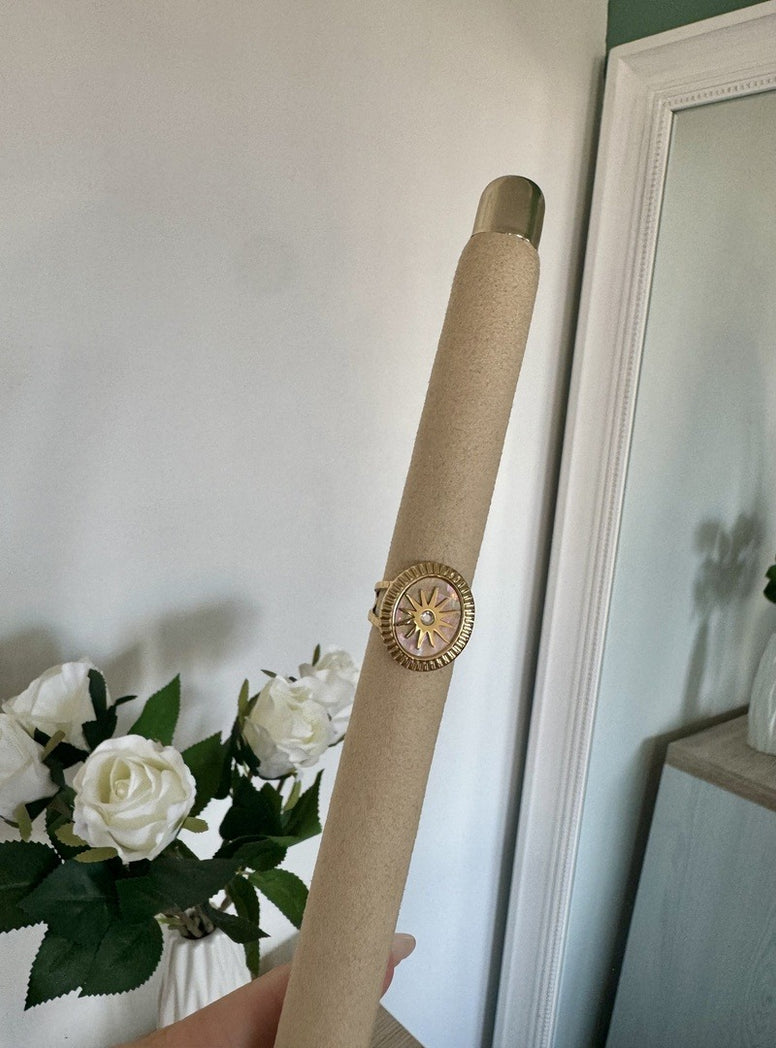 \n \nBague réglable composée d'une pièce ovale sertie d'une feuille de nacre véritable et composée d'une étoile et d'un strass. \nMatière : acier inoxydable. Hypoallergénique, il résiste à l'eau et ne noircit pas. Taille recommandée : 52 à 56. \n \n