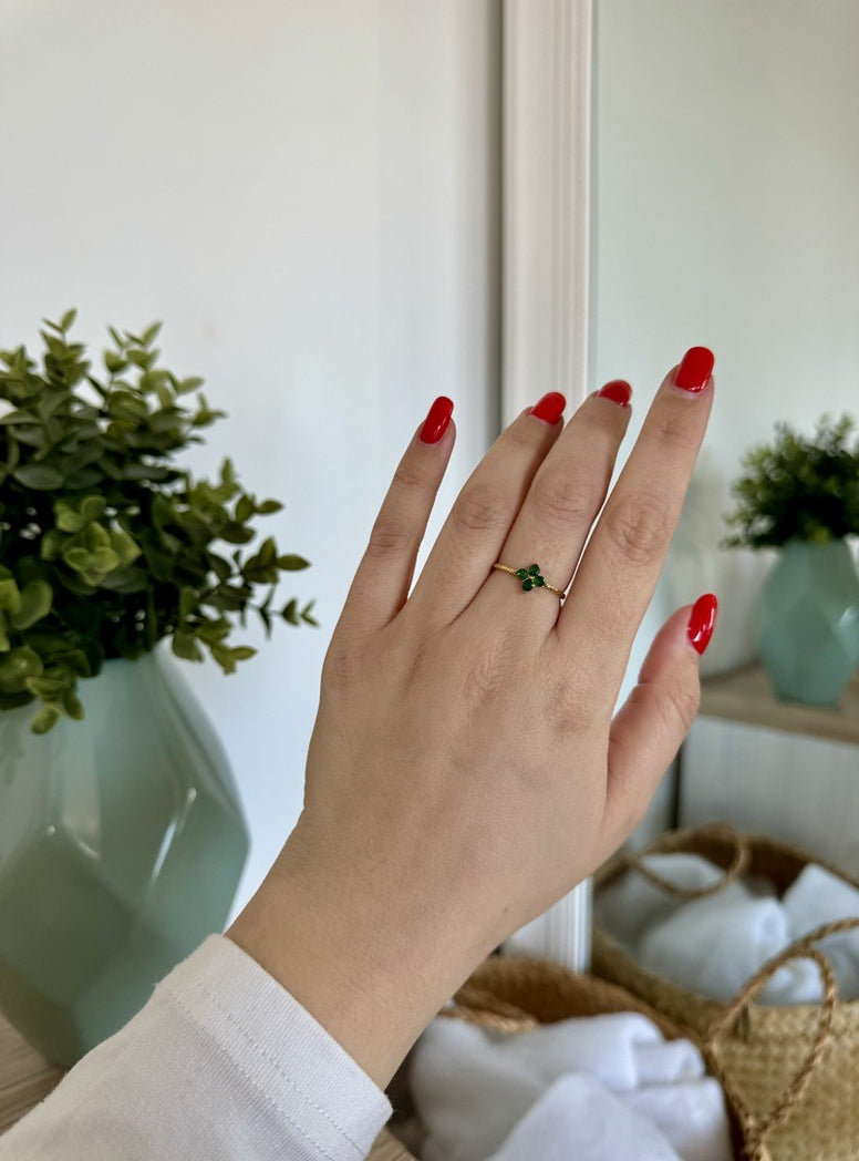 Bague fine en acier inoxydable composée d'un anneau aux petits pois gravés et d'un trèfle serti de 4 oxydes de zirconium ronds.