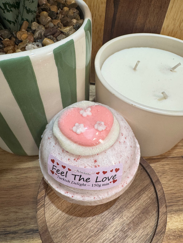 Qu'est-ce qu'il faut aimer dans la bombe de bain Feel The Love... Vous ressentirez l'amour ce soir avec un délicieux parfum de délice turc. (La décoration sur le dessus est disponible dans un assortiment de couleurs et de motifs)