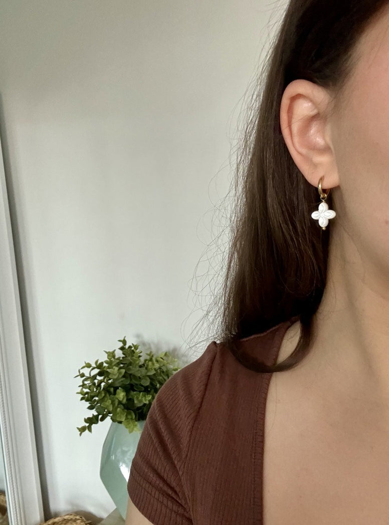 Boucles d'oreilles type créoles avec fermoir à charnière en acier inoxydable composé d'un pendentif en forme de trèfle nacré.