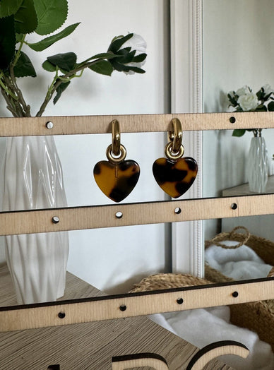 Boucles d'oreilles type créoles avec fermoir à charnière en acier inoxydable composées d'un coeur plat en acétate léopard