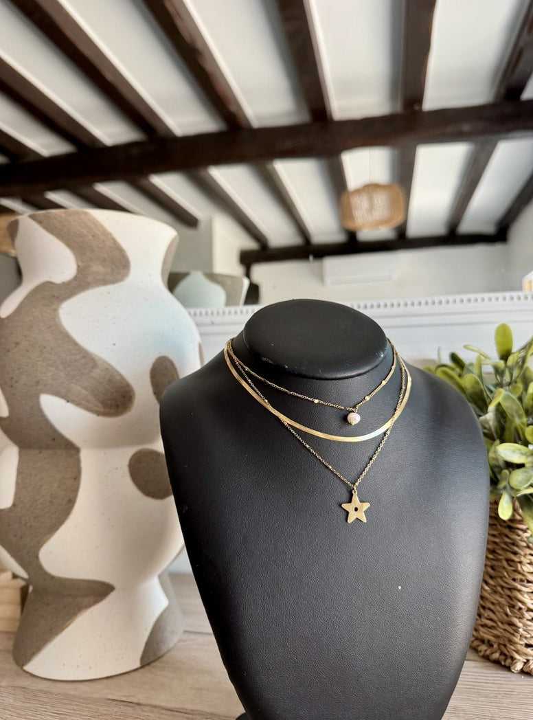 Collier multirangs sur chaîne en acier inoxydable composé de 3 rangs, en maille forçat et à boules avec un pendentif étoilé, une maille miroir et une maille gourmette fine avec une petite perle d'eau douce.