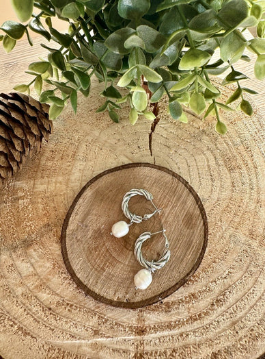 Boucles d’oreilles type créoles dormeuses en acier inoxydable composées d’un anneau torsadé et d’une perle d’eau douce pendante.Dimensions de la boucle : 20 x 40 mmDimensions de la créole : 20 x 20 x 5 mmGarantie sans nickel, sans cadmium, sans sel de plomb.Résiste à l’eau et ne noircit pas.Étant des perles d’eau douce, leurs formes et leurs couleurs peuvent varier d’une pierre à l’autre.