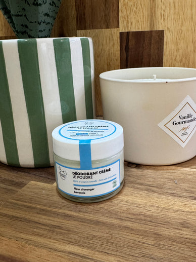 Un déodorant crème original qui s’applique au doigt comme une crème, sur les aisselles. Parfum délicat de fleur d’oranger et lavande