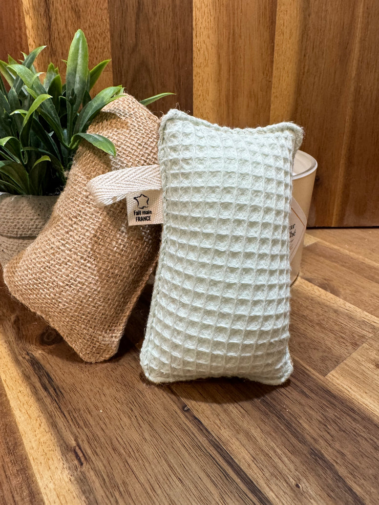 Éponge légèrement abrasive sur sa face en jute, et douce et absorbante sur sa face en coton nid d'abeille. Rembourrage: ouate de polyester recyclé.