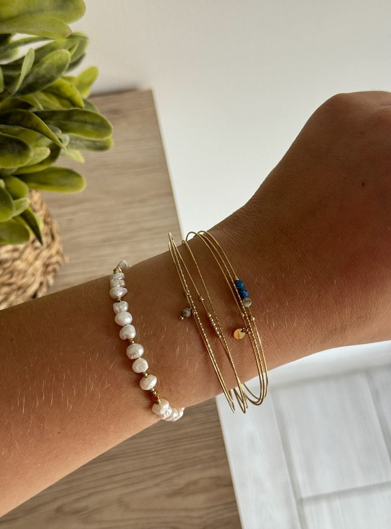 Bracelet type jonc semainier en acier inoxydable composé de 7 anneaux (3 striés et 4 lisses, perlés avec des pierres naturelles).
