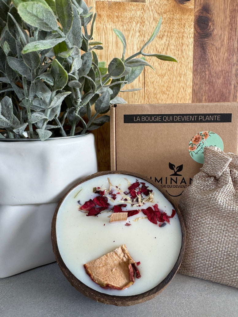 Luminante, un concept unique : une bougie parfumée qui devient plante. Une fois la bougie consumée, le contenant peut être utilisé pour planter les graines surprises fournies avec le terreau présent dans nos coffrets.