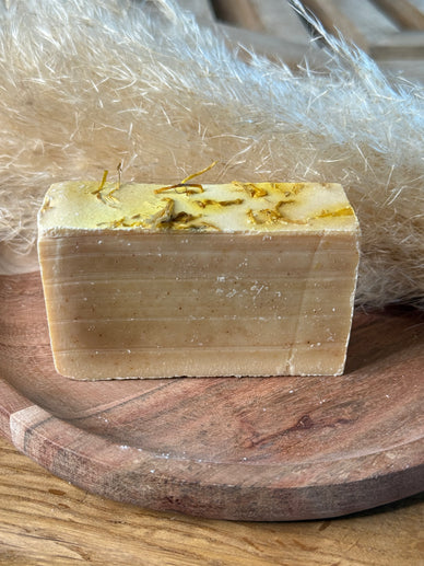 Savon artisanal parfumé à l'huile essentielle d'orange douce bio avec inclusion de feuille de calendula. 1 savon de 135 gr.